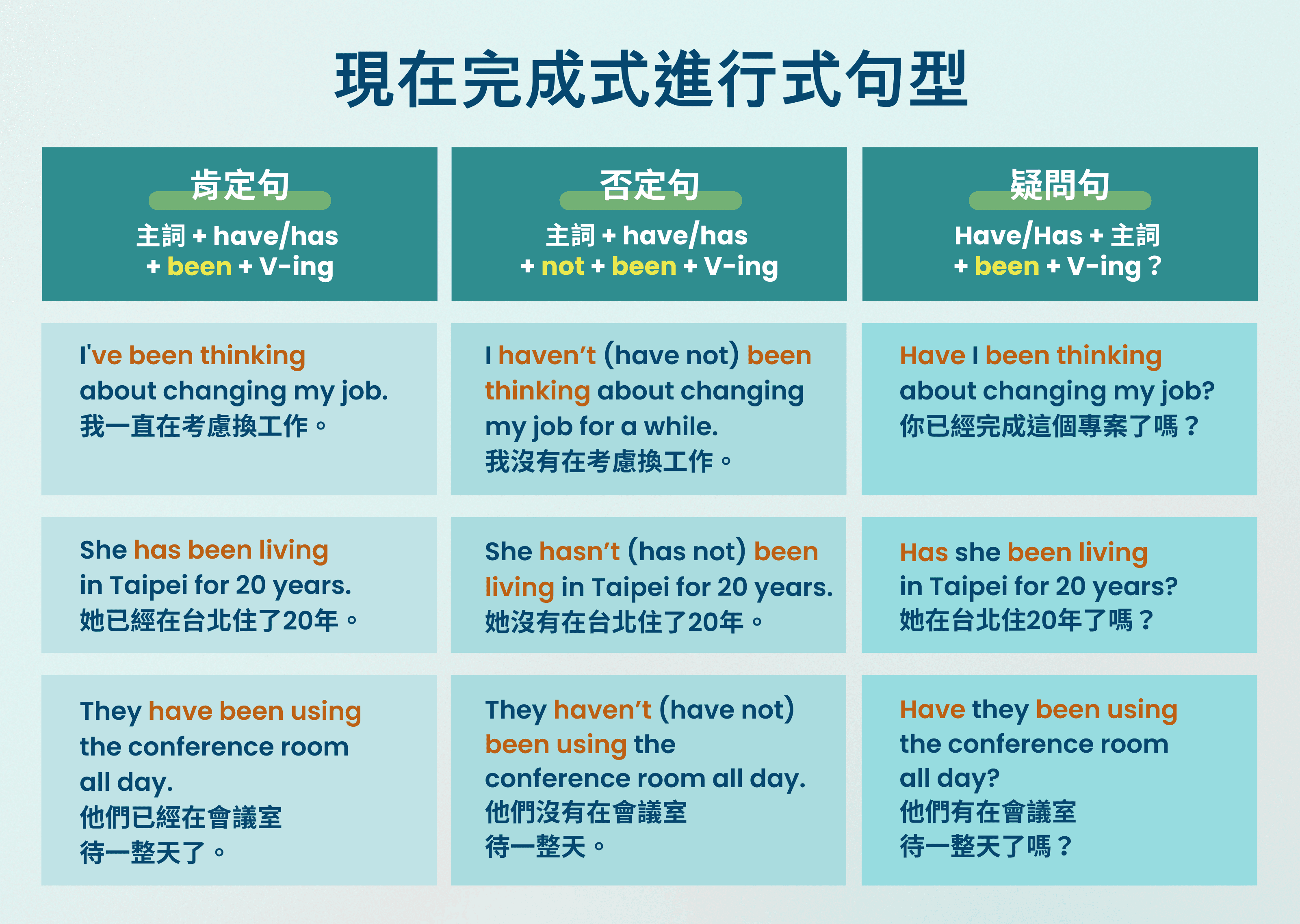 希望透過今天的解析與練習,大家都能掌握「現在完成進行式」(Present Perfect Continuous)的秘訣!它是表達「持續性動作」的最佳時態,能讓你的英文敘述更精確、更有畫面感!請同學一定要記住以下關鍵點: